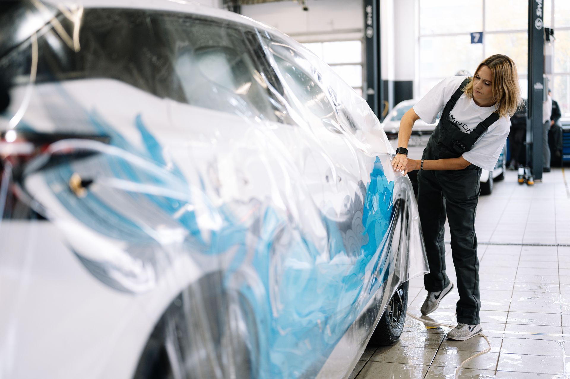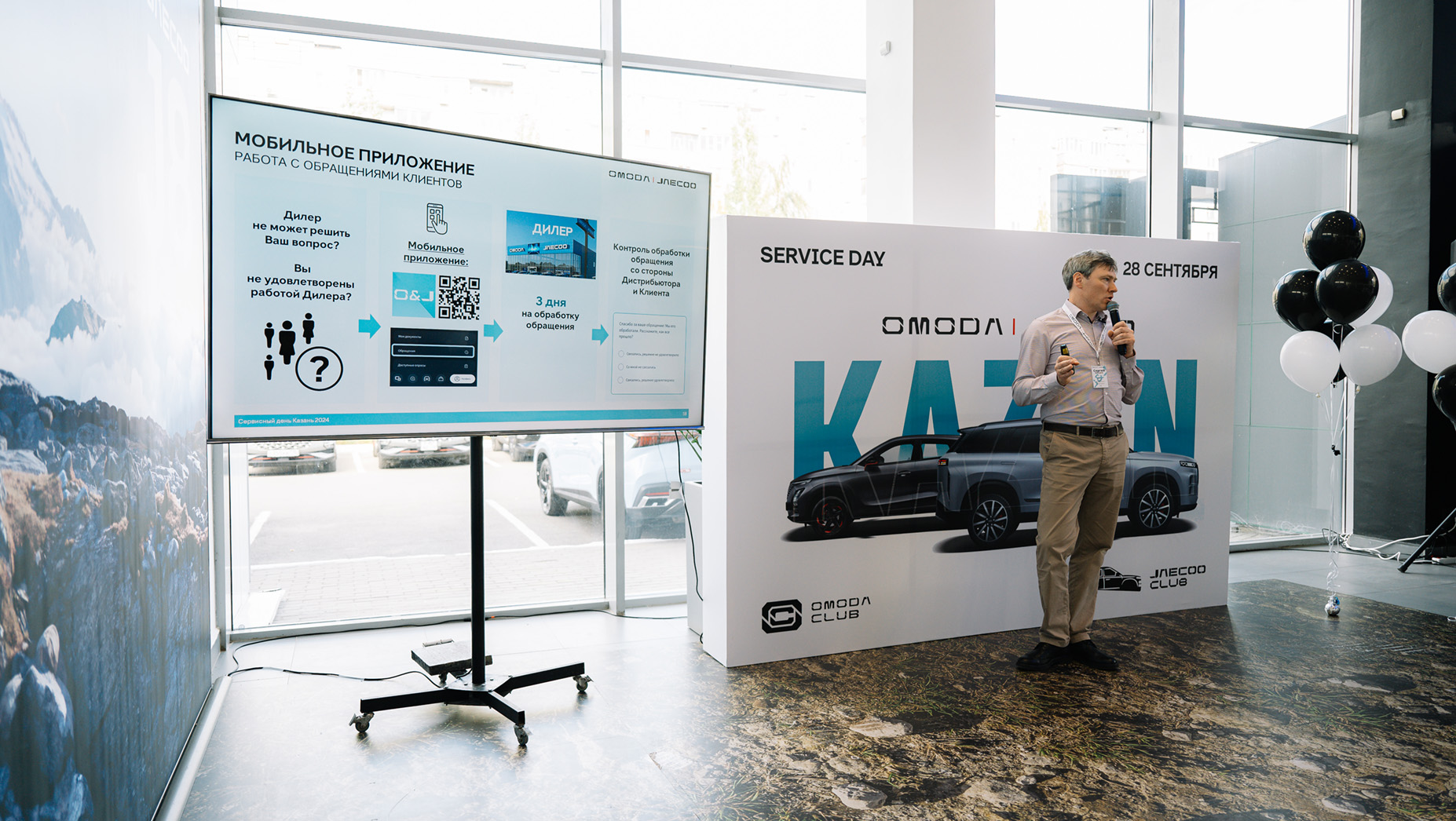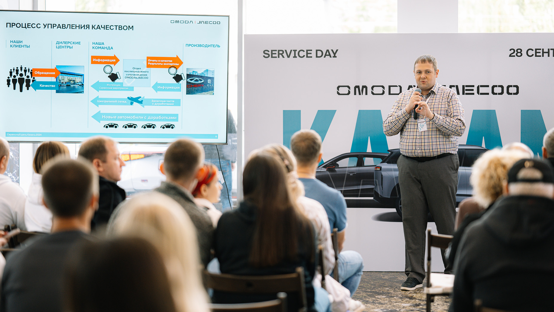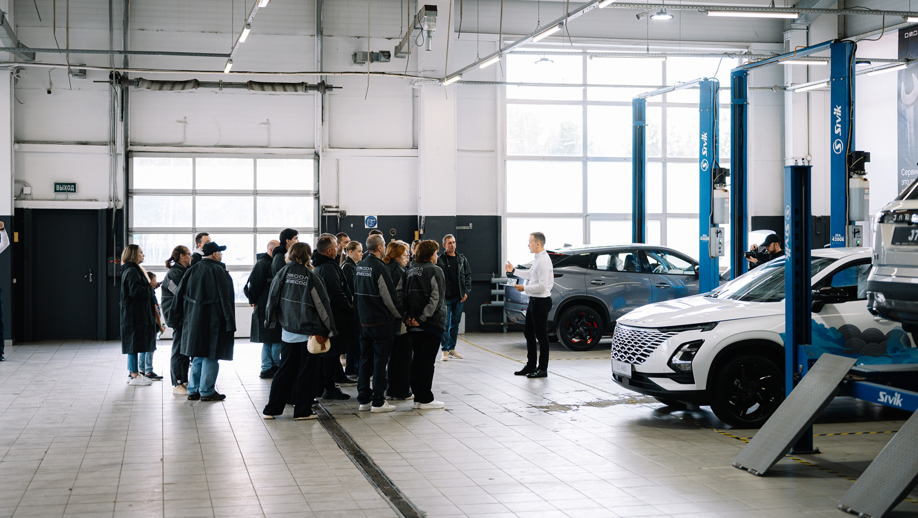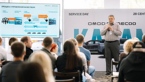 Утром следующего дня нас ждет сервисный день в дилерском центре «Квазар». Сотрудники представительства OMODA | JAECOO рассказывают о целях и задачах департамента послепродажного обслуживания — это именно тот отдел, который отвечает за сервисное обслуживание и разрабатывает дилерские стандарты. Руководители направлений детально описывают алгоритм обработки претензий и отвечают на самые частые вопросы владельцев. Сотрудники дилера показывают, как проходит ТО и процесс оклейки автомобиля специальной ливреей OMODA INDIVIDUALITY.